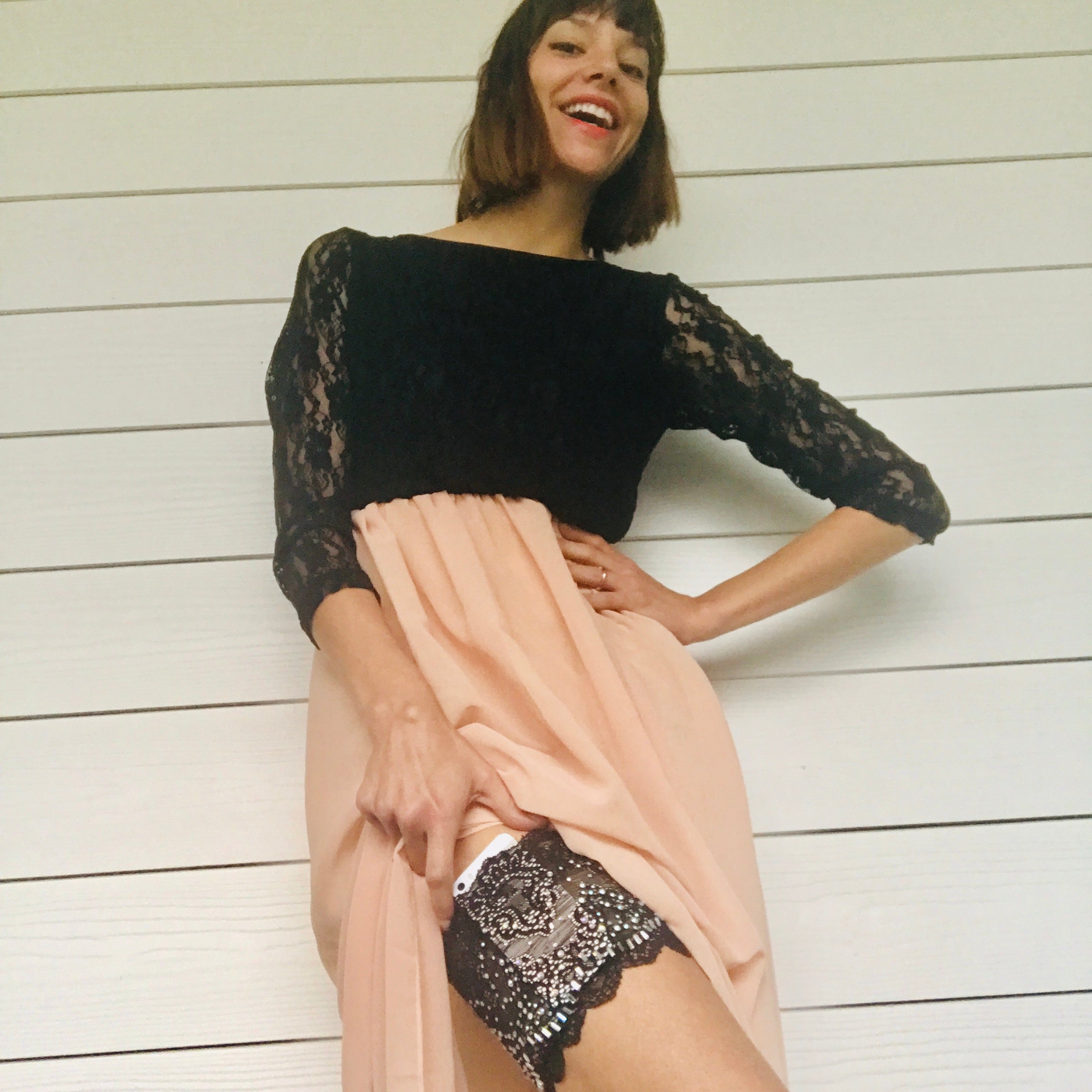 1. Put the garter on your clean, lotion-free, bare thigh (or over fishnet hosiery).